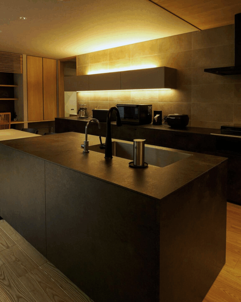 キッチン壁面にはサラリとした「マット」を使用。機能性とデザイン性のどちらも併せ持つ製品だからできる統一空間です。