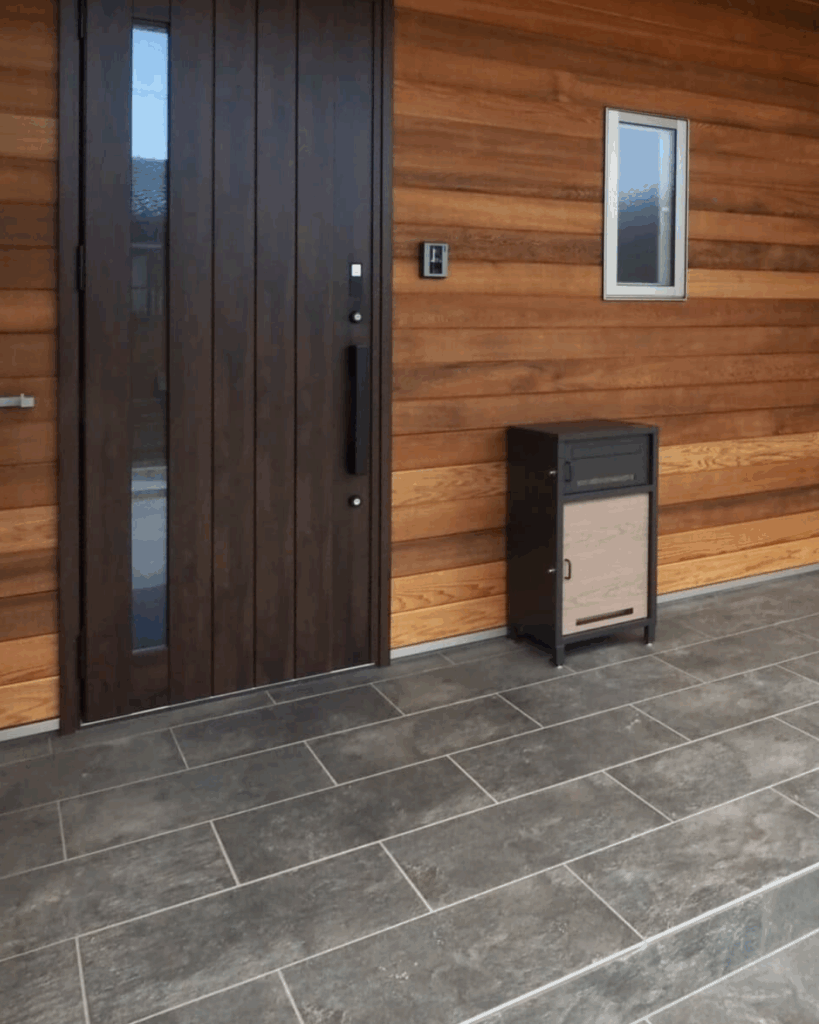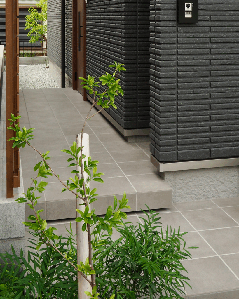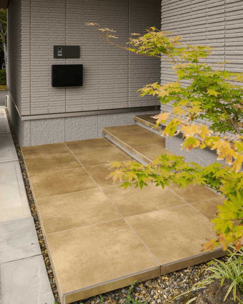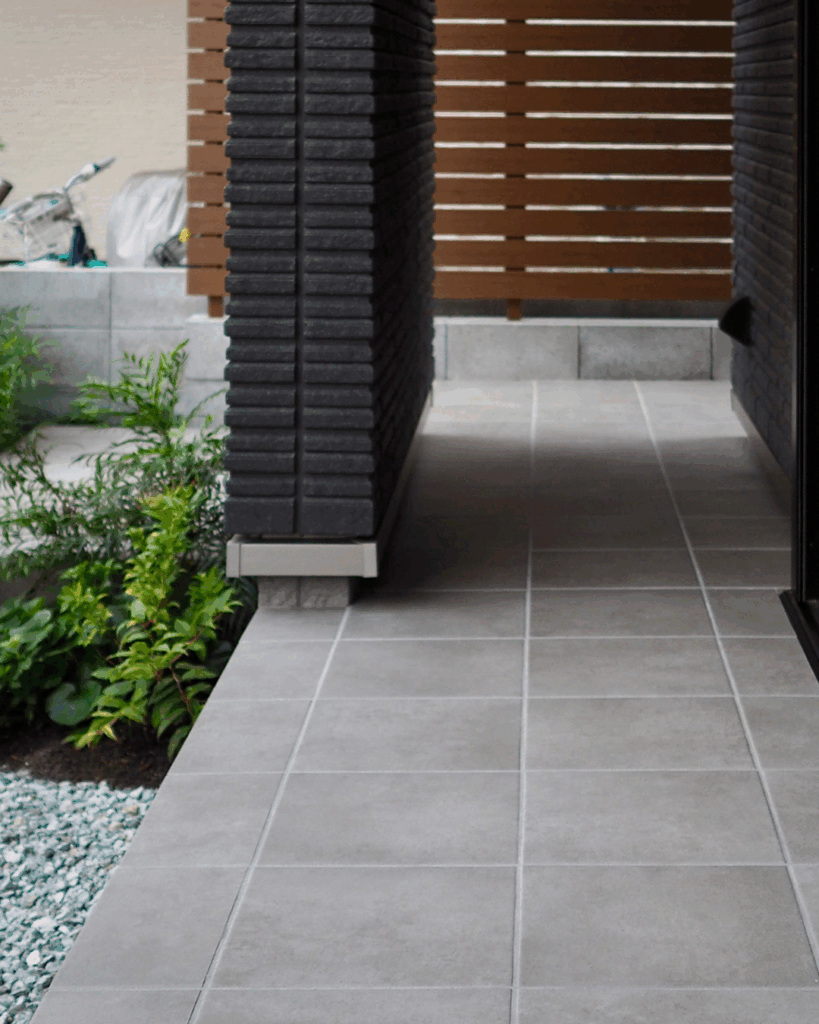 車寄せから玄関へ、同じデザインのタイルで室内までを統一でき、家全体にまとまりのある美しさが広がります。