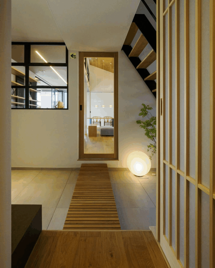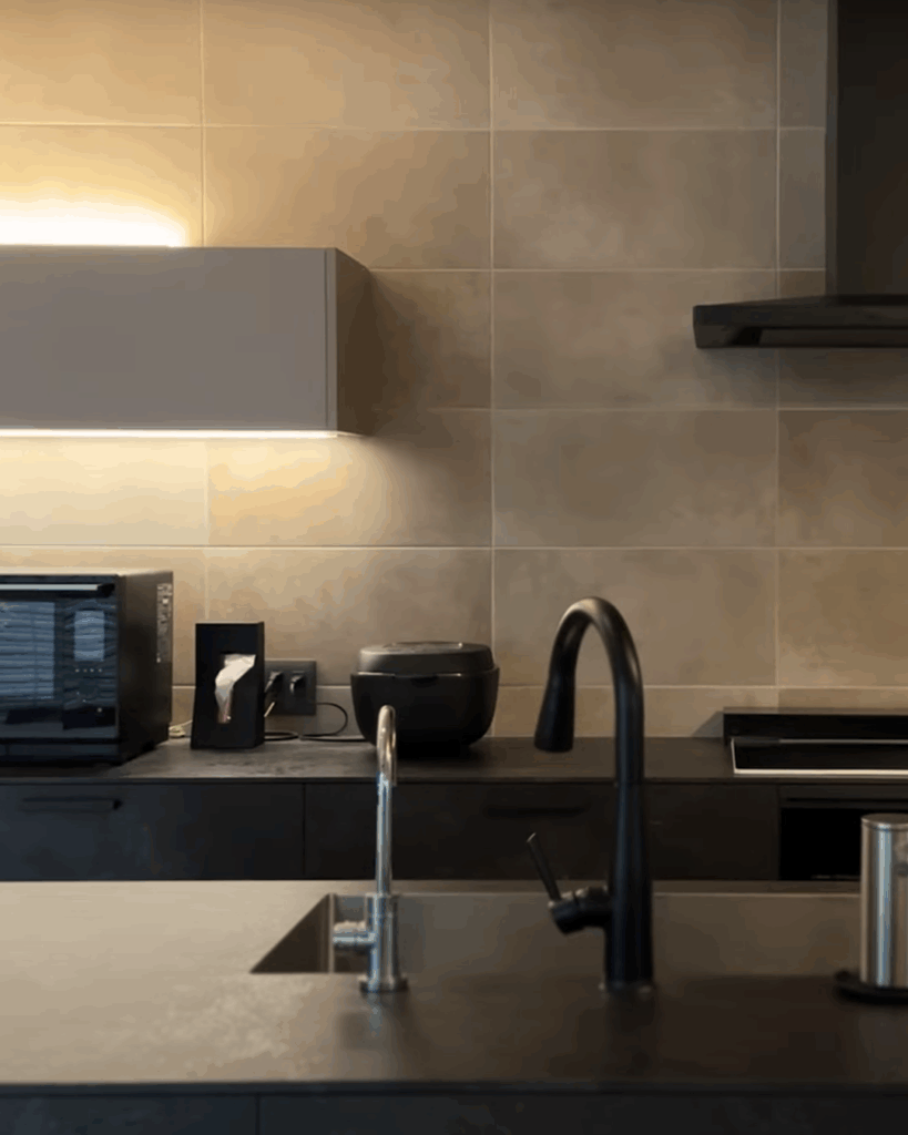 たとえば、床と壁、土間に同じタイルをつなげていく。色と質感を貫くことで、家全体がひとつの流れを持ち、静かなまとまりを生み出します。整った空間の美しさは、感覚的に心地よさを感じるようになるのです。