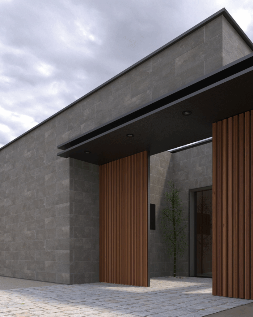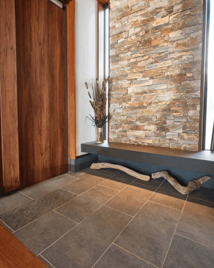エントランスから玄関へ、同じ石調のタイルでつながる統一空間です。