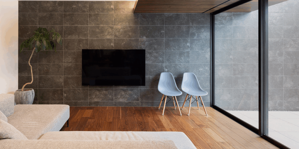 テレビ背面のアクセントウォールに、華やかな石目模様で重厚感を演出しています。テラスへ伸びる壁も同一のタイルで視覚的に空間を広く見せる素敵な施工例です。
