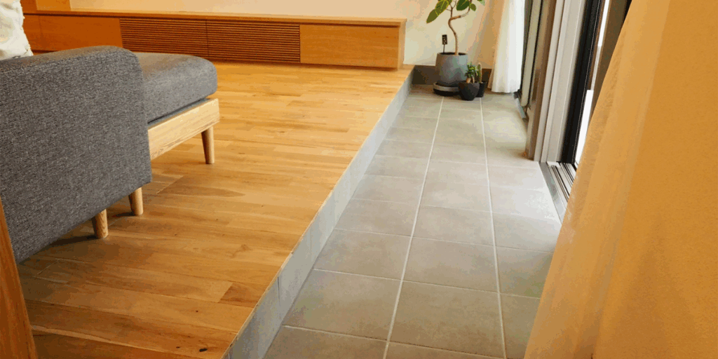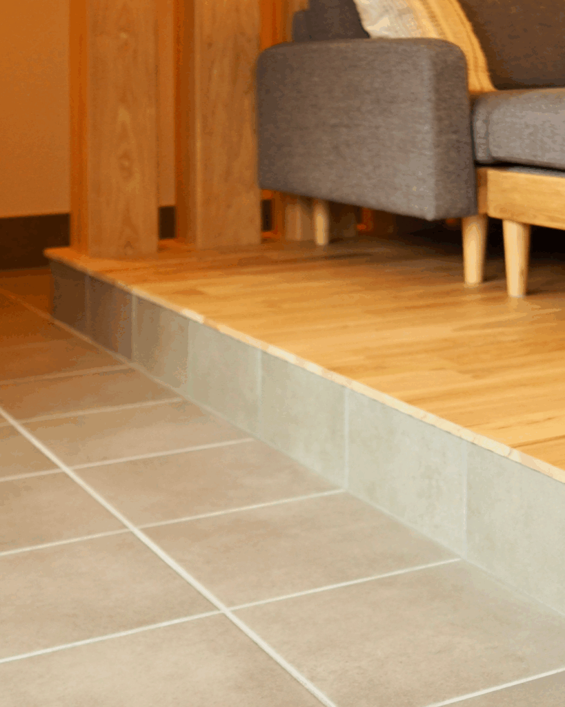 300角サイズのタイルは汎用性が高く、小さな小上がりにもきれいに施工ができます。