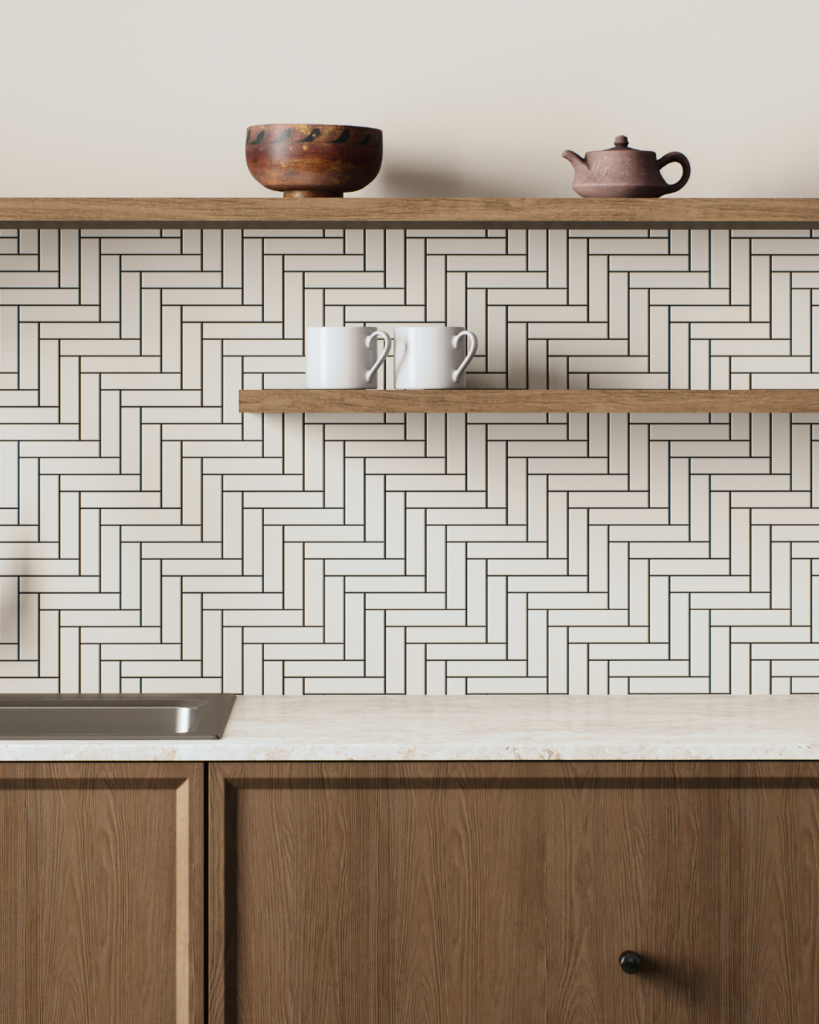 同じタイルを使って目地の色を変えてみましょう。こちらは白目地です。タイル全体が明るく映ります。