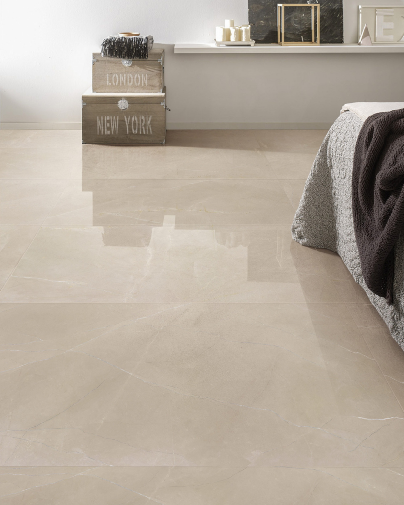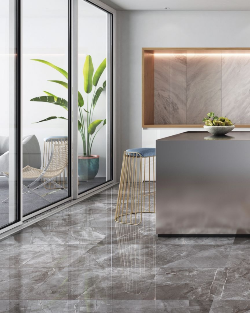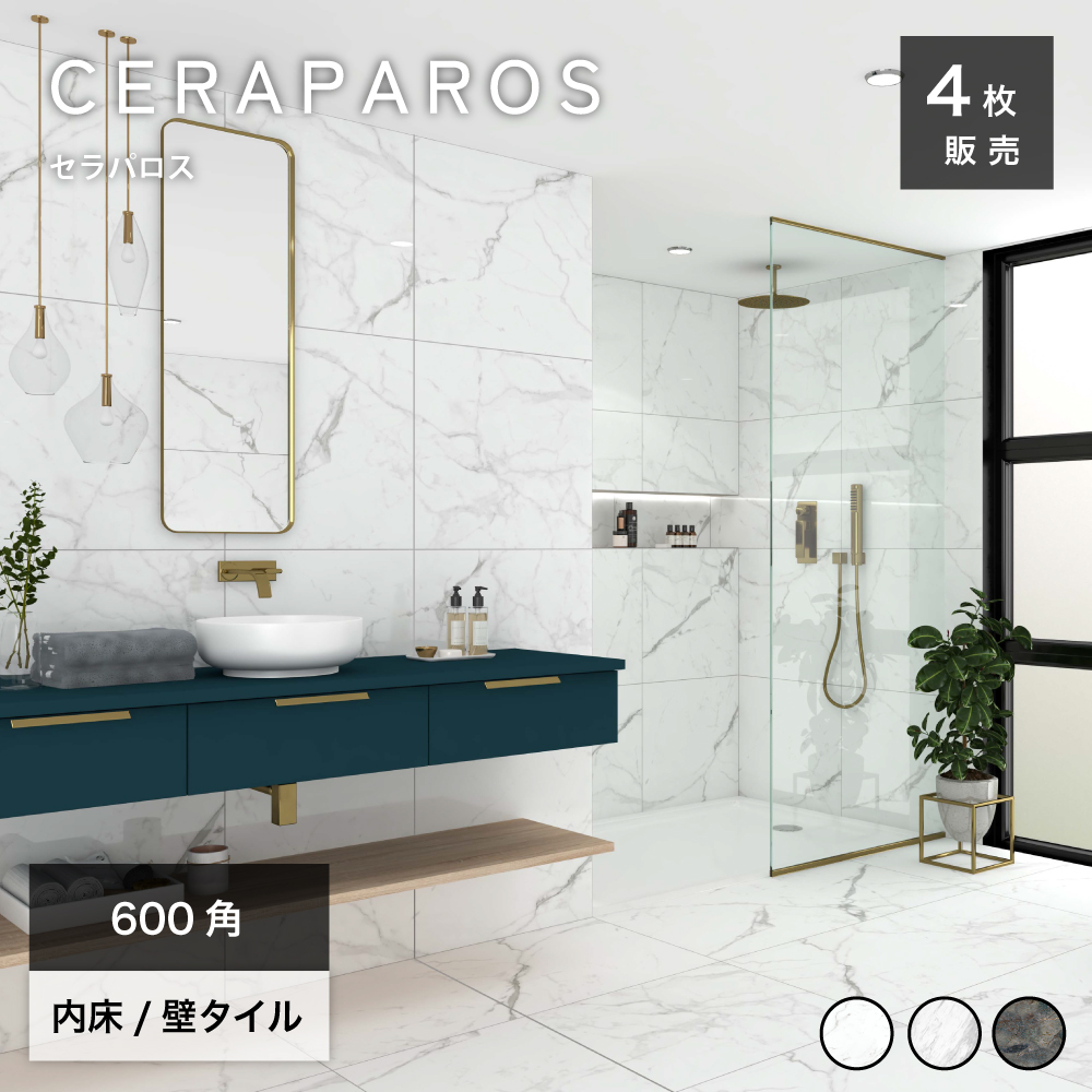 複雑なマーブル模様を緻密に再現したセラパロス。鏡面磨きで艶のあるタイル。