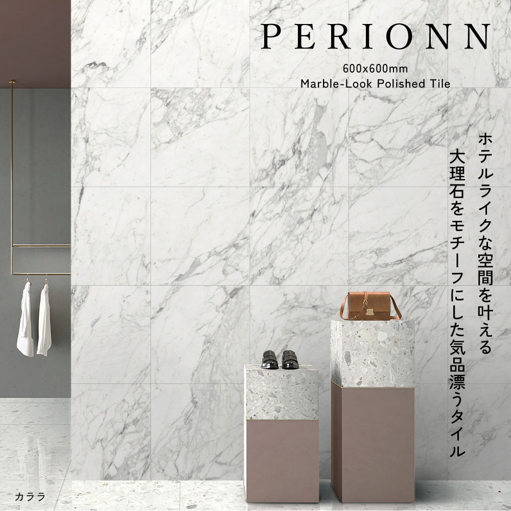 柔らかな発色とゆったり流れるマーブル模様。ブライト・マットの面状があり、600角・600x300mmサイズも選べます。
