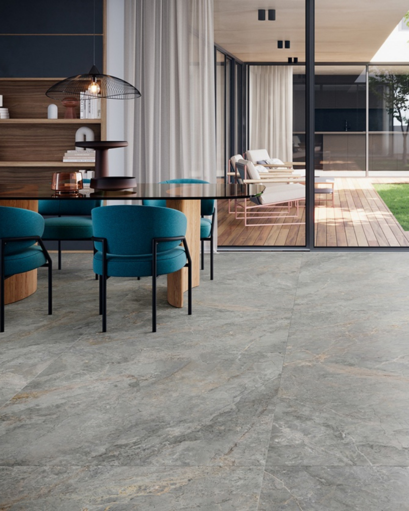 イタリア産の大理石セルペジャンテを再現した無釉磨きタイル。木目調の美しい流れ模様が特徴です。