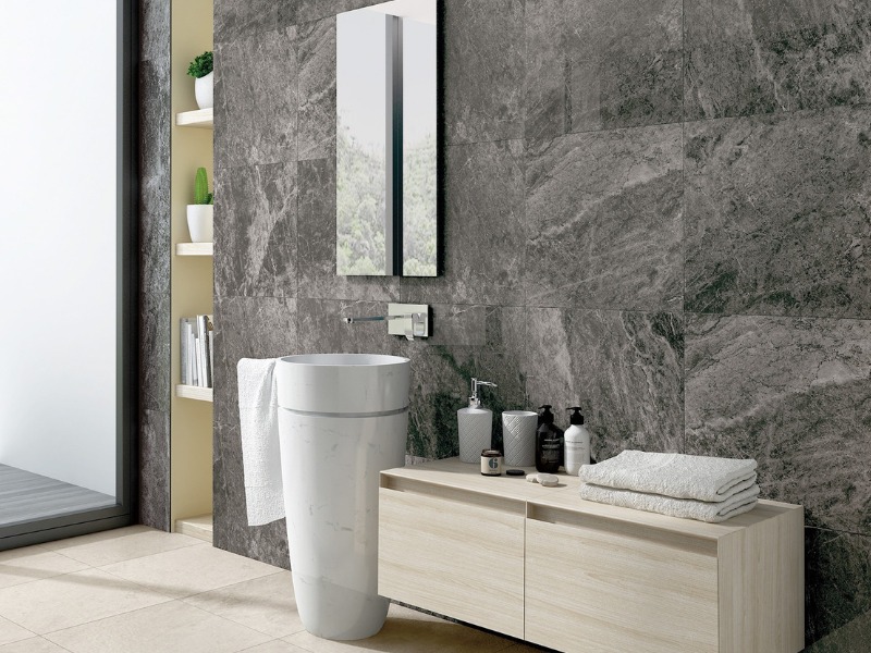 現代の住宅や店舗で非常に人気のある色です。都会的でモダン、さらにどんな色ともマッチするメリットがあります。単なるグレーの無地とは異なり、石目が持つ独特の表情や陰影が、空間に深みと高級感を与えます。