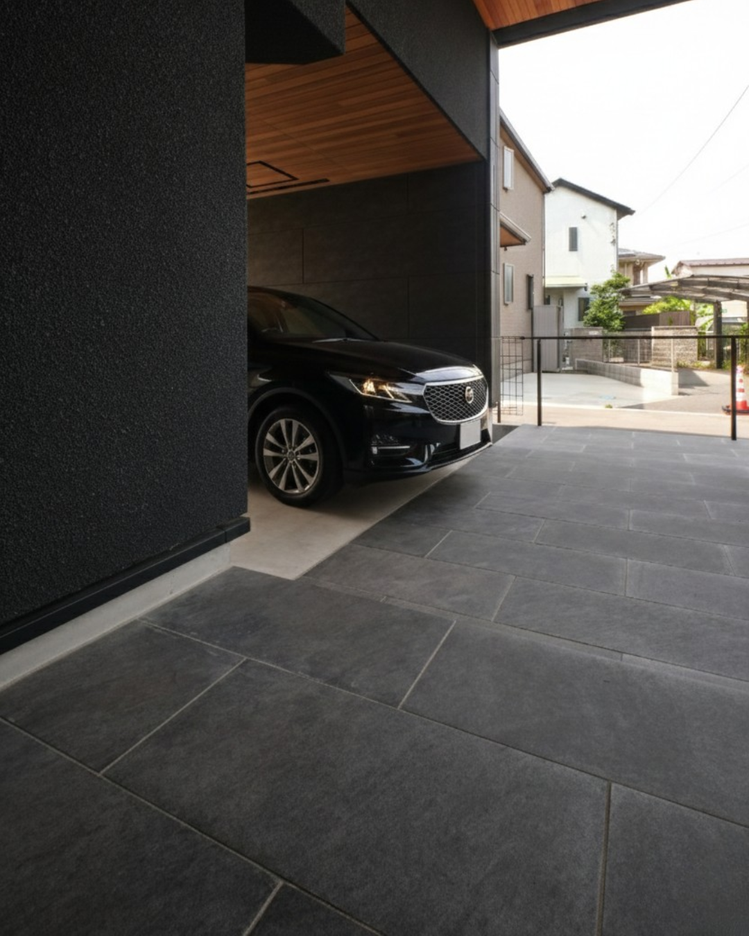 玄関前の車寄せをタイルでつくる|乗用車対応の舗石タイルで叶える高級外構