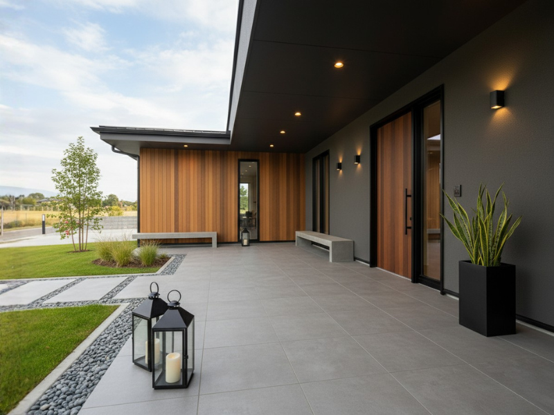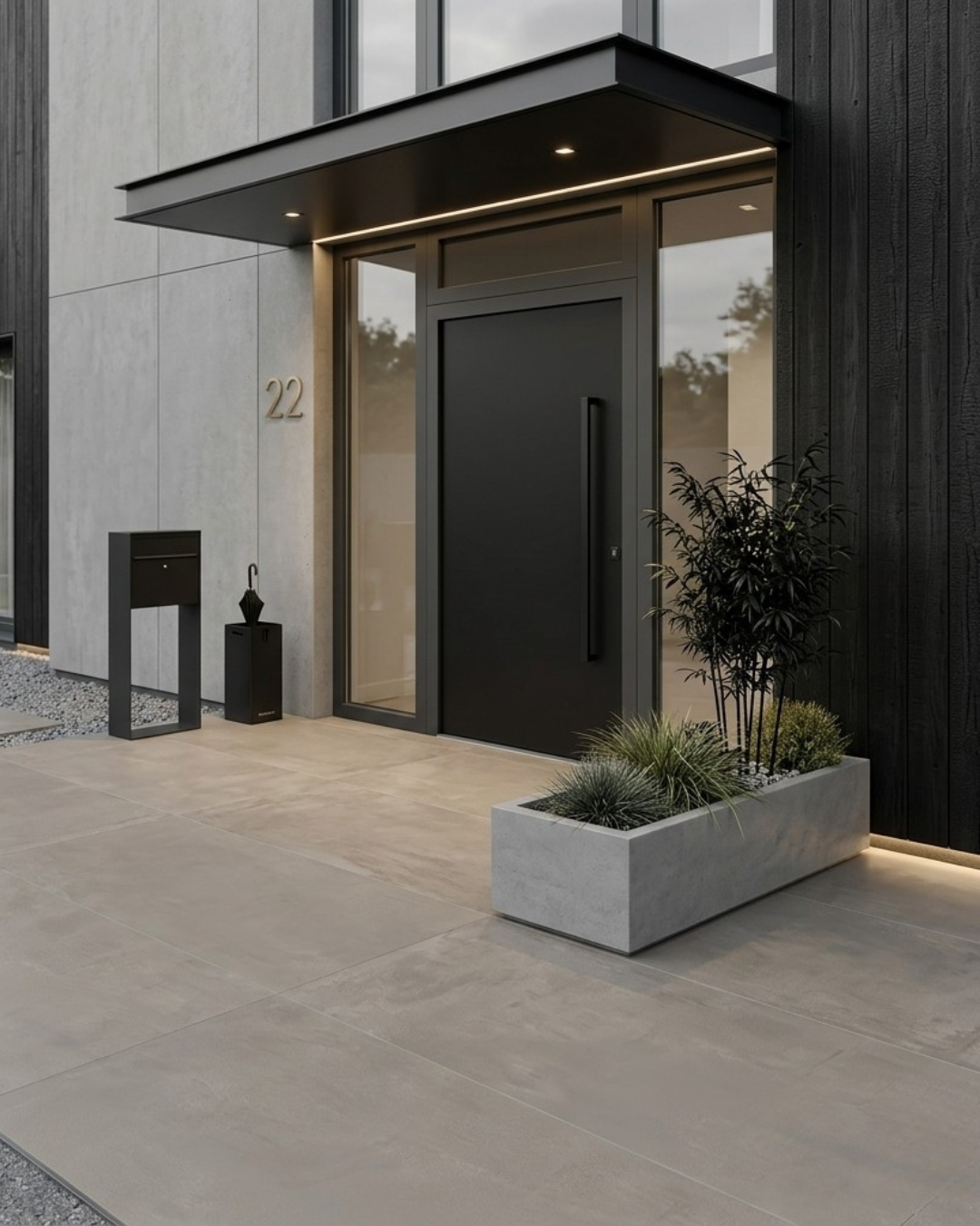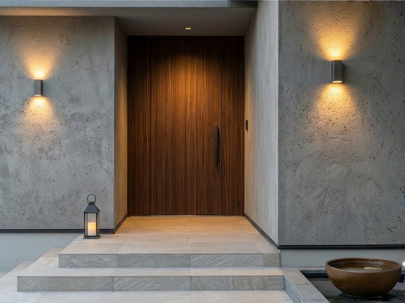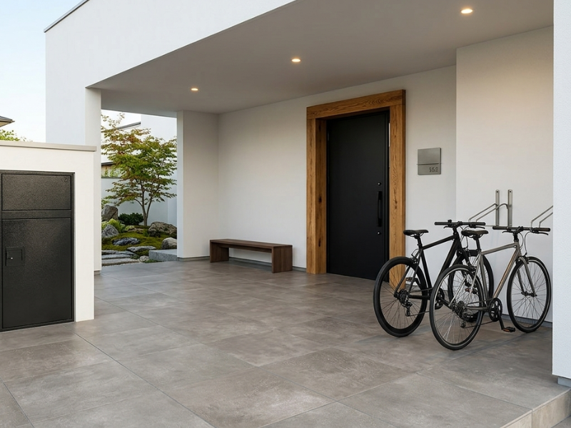 やや濃いグレージュなら、玄関ドアや照明で少し明るさを加える。逆に明るめのグレージュなら、黒や濃色の金物で空間を引き締める。