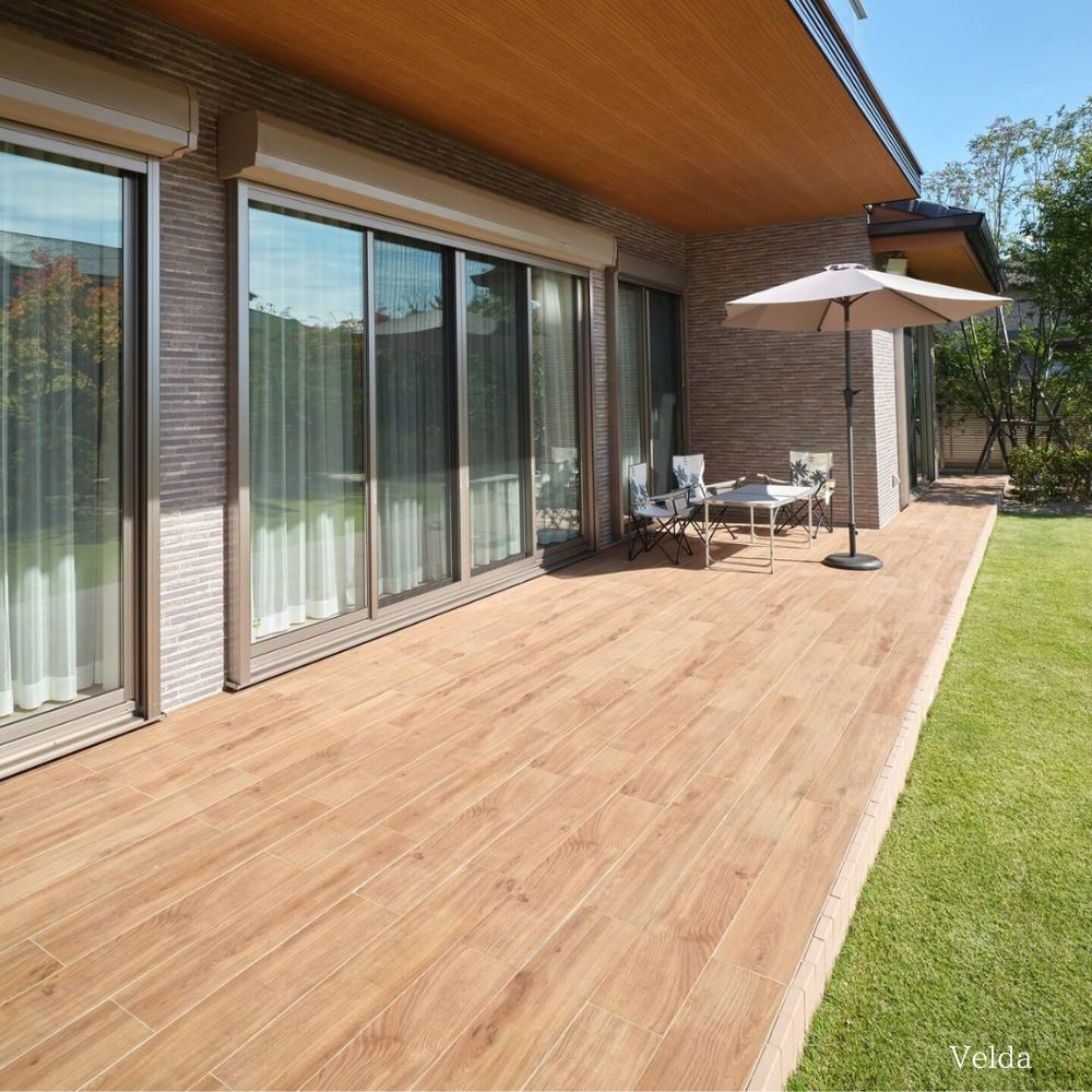 天然木の個性ある自然な表情を厚ものタイルにしました。劣化のないタイルならではの特性をエクステリアに。