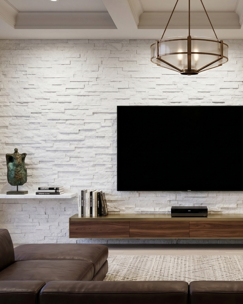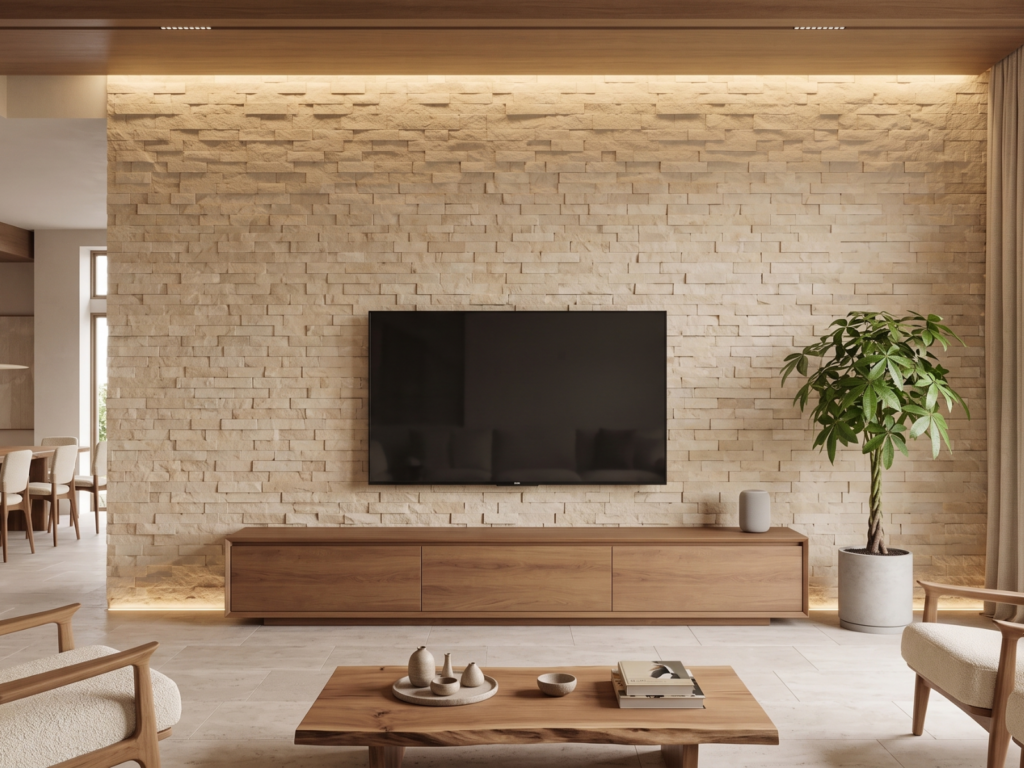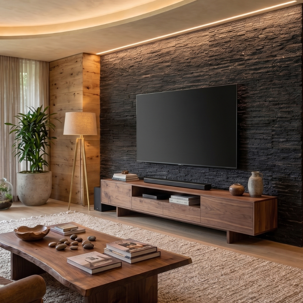 テレビ背面やソファの後ろなど、視線が自然と集まる場所に天然石を取り入れることで、空間に“軸”が生まれます。