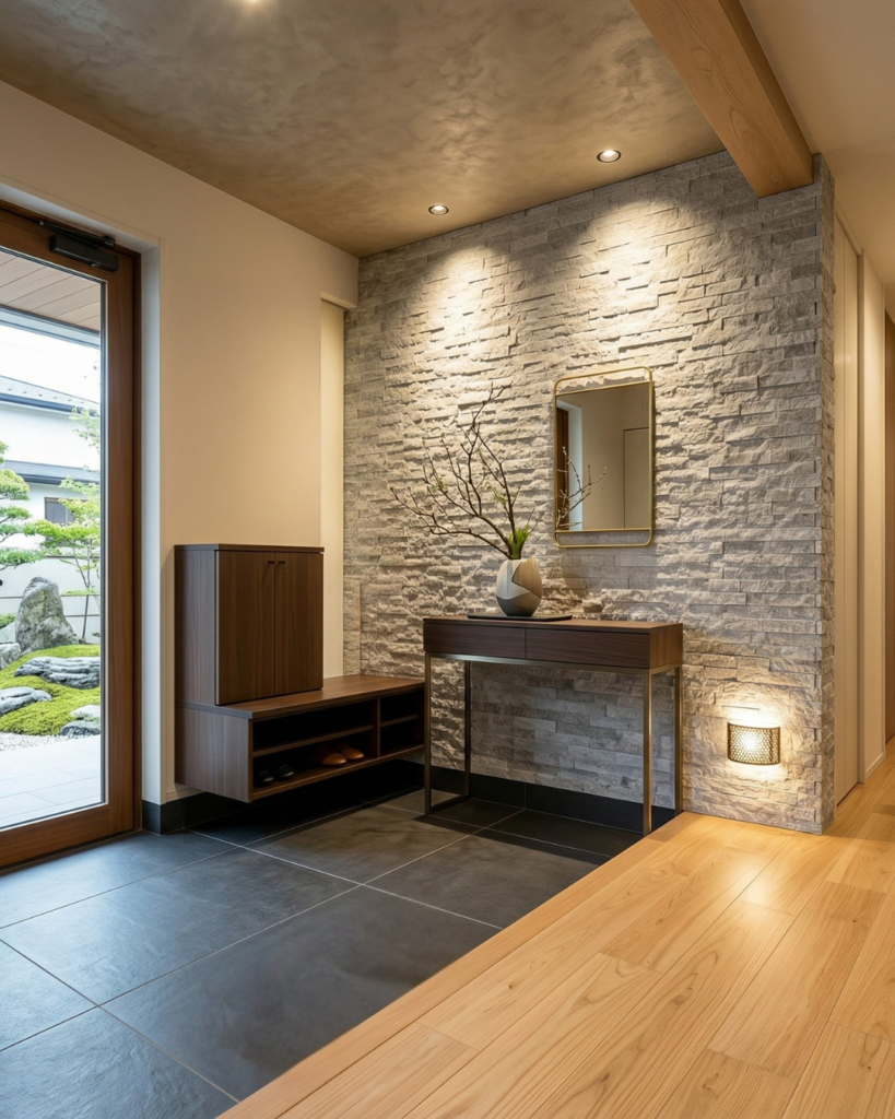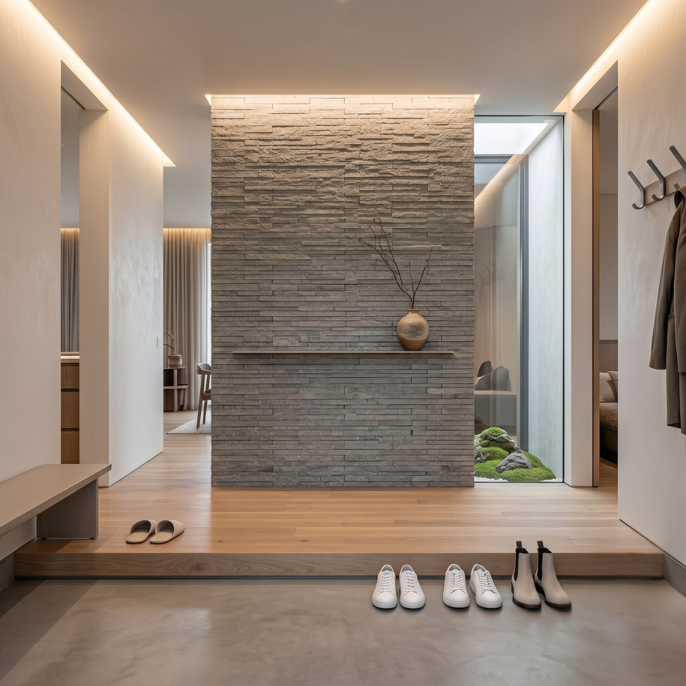 ドアを開けた瞬間、視線の先に天然石の壁があるだけで、空間の質が一段引き上がります。