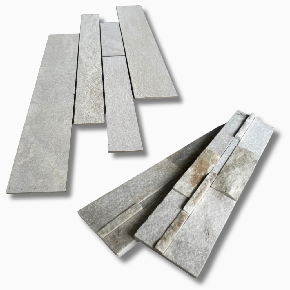 タイルは均一で整った仕上がりが特徴ですが、天然石は一枚ごとに表情が異なり、陰影や質感に個体差があります。