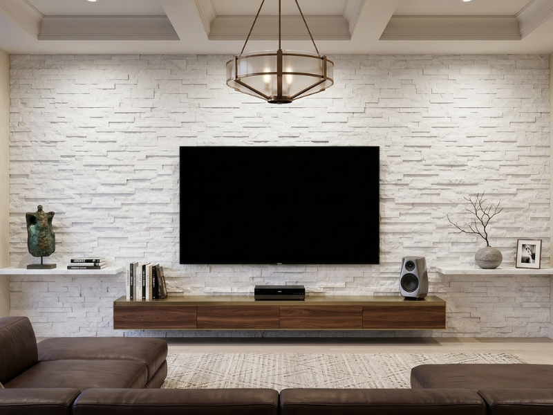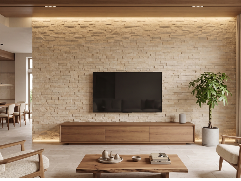天然石の壁は、視線が集まりやすい場所に取り入れることで、その魅力を最大限に発揮します。実際に多く選ばれているのは、テレビの背面やキッチンカウンターの側面といった、空間の中で自然と目に入る位置です。日常の中で視線が向かう場所に取り入れることで、空間全体の印象をさりげなく引き上げてくれます。